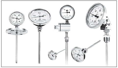 測量氣體和液體的溫度。與玻璃溫度計(jì)相比,它具有無汞損壞、讀數(shù)清晰、堅(jiān)固耐用的優(yōu)點(diǎn)。我生產(chǎn)多用途雙金屬溫度計(jì),規(guī)格品種齊全,質(zhì)量穩(wěn)定可靠,可廣泛應(yīng)用于工業(yè)、農(nóng)業(yè)、國防和科研領(lǐng)域的各個(gè)部門。雙金屬溫度計(jì)結(jié)構(gòu)特點(diǎn)和工作原理雙金屬 溫度計(jì)(以下簡稱溫度計(jì))使用螺旋加熱器雙金屬板作為溫度傳感元件,并將其安裝在保護(hù)套中,一端固定(固定端),另一端(自由端)連接到薄軸上,軸端帶有指針。當(dāng)溫度變化時(shí),溫度傳感元件的自由端立即旋轉(zhuǎn),并通過細(xì)軸驅(qū)動(dòng)指針以指示刻度盤上的溫度變化。直行溫度計(jì)通過轉(zhuǎn)向傳動(dòng)機(jī)構(gòu)驅(qū)動(dòng)指針。外殼材料包括鋼板、鑄造鋁合金和不銹鋼板??烧{(diào)角度溫度計(jì)的頭部可借助波紋管、轉(zhuǎn)角機(jī)構(gòu)和其他部件從角度調(diào)整為直線或從直線調(diào)整為角度。